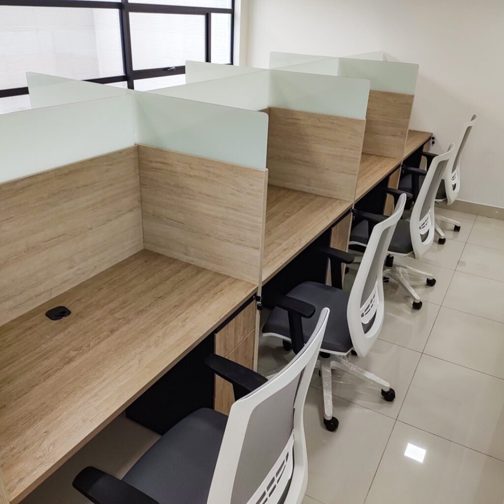 Para este proyecto suministramos puestos de trabajo operativos tipo call center junto con sillas giratorias 100% ergonómicas. Fabricamos escritorios gerenciales con un diseño innovador que renovó la imagen de la oficina, proyectando modernidad y profesionalismo. Además, suministramos un archivo rodante que optimiza el almacenamiento de equipos y papelería, aportando funcionalidad y orden al espacio.
